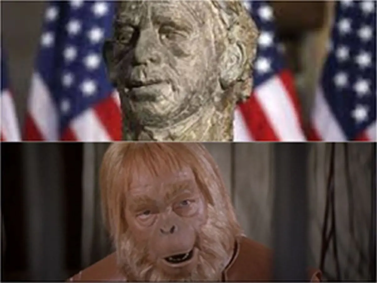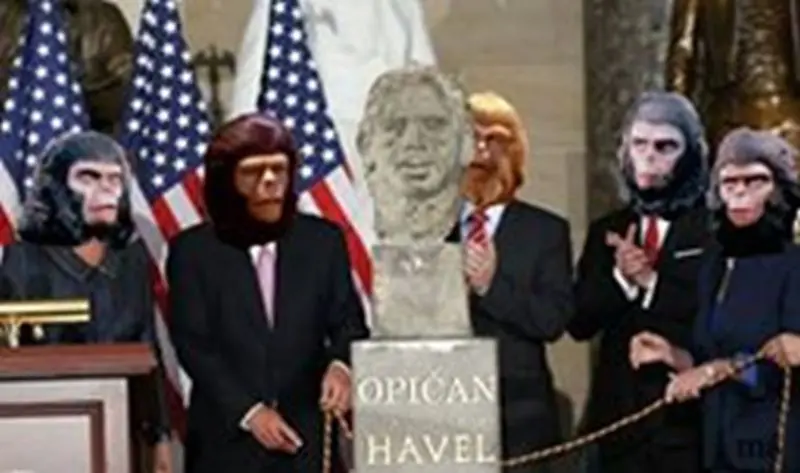 A pak se vam vybavi sceny z Planety opic, a ste doma. To přece neni naš prezident, to je jakysik opičak. A ostatni vam řikaju – nee, to neni opičak, to je umělecky zaměr. To robil naš najlepši čechoamerycky sochař, to je uměni! A ja řikam – jake uměni? To je opica. Copak naš prezident měl take odstavajici uši? Copak měl plešku vyčesanu až na zada? Copak chodil neoholeny a měl předkus?
