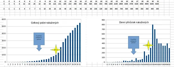 Ovšem zjištěny počet nakaženych neznamena, že se nakazi v přištim tydnu. Oni už nakaženi su fčil, enem se to ještě nevi. Podle zkušenosti z protestovani všech 3000 obyvatel italskeho města polovina z pokaženych obyvatel nepociťovala žadne přiznaky. A za dva tydny jejich organyzmy porazili virus a na testach už byli negatyvni. Bohužel, po celu tuto dobu mohli rozšiřovat to svinstvo okolo sebe, aniž by to tušili.