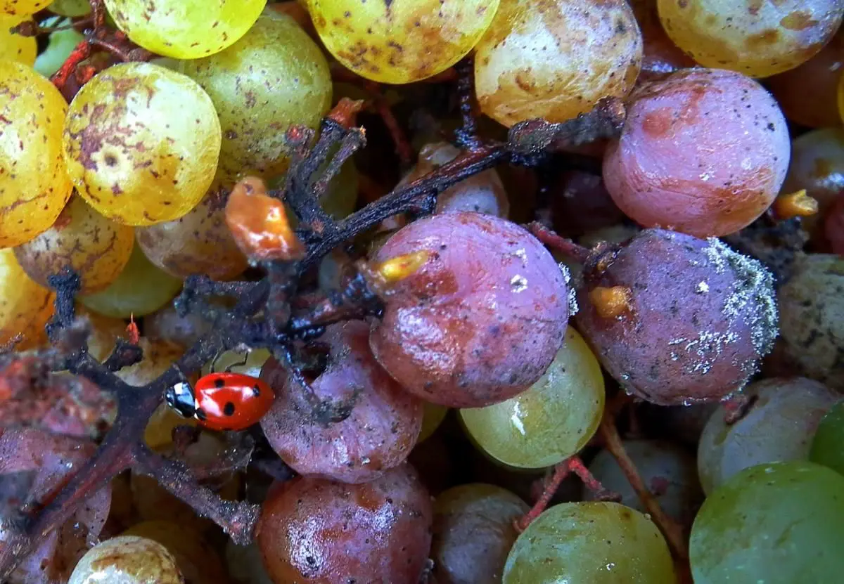 …pokud se nepodaři všecky bedrunky včas pozabijat a rozpulit, pak jejich exkrementy, zanechane na hroznach (viz bily humus vpravo nahoře), pozměni vyslednu chuť vina. Take plesnivě posrane vino se pak prodava hodně draho, pod nazvem Tokajske.