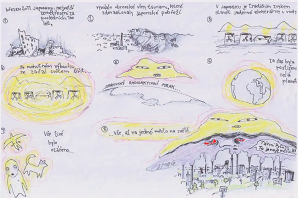Bolševiky už naštěsti přestalo bavit nechavat jezdit tramvajky zadarmo. Rezygnovali. Lude tež rezygnovali. Všecko rezygnovalo. Aji ryby radši odpluly z Odry do Baltu. Posledni, kdo ještě nerezignoval, su děcka. Ty jedine a posledni bojuju. Když už ničim jinym, tuž aspoň kresbama.