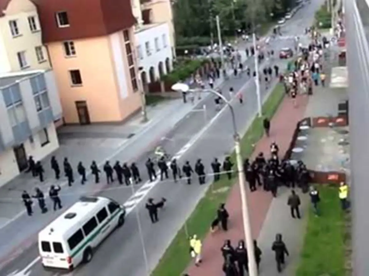 Mezitim utočnica demoluje plot knajpy a chysta se k dalši demolici, ale policija už vi, co robit. Je tady přece proto, aby pomahala a mlatila. Teda pomahala a chranila. Přesto ještě neni cele agresi konec. Zčistajasna se u plotu objevuje novy agresor v maskačach a snaži se dodat agresorce novu silu do utoku. Všecko marne, policija už vi, co ma robit. Agresor se nemože divit, že mu hubu odřeli o asfalt a agresorka skončila za plotem. Može byt rad, že přežil. Debil.