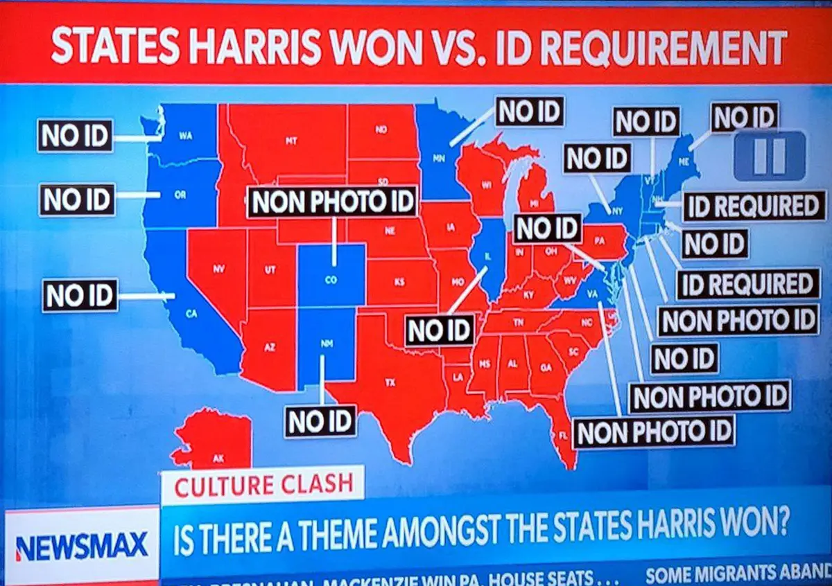 Zajímavá souvislost ve výsledcích prezidentských voleb v USA: Americký televizní kanál Newsmax uveřejnil mapu USA s volebními výsledky prezidentských voleb (upozornil na ni Elon Musk). Ovšem ne ledajakou. Newsmax do ní přidal informaci, který stát vyžaduje identifikaci voličů, a který nikoli. Mapa ukazuje, že ve všech 12 státech, které nevyžadují žádnou identifikaci voličů, zvítězila Kamala Harrisová. Ve čtyřech státech, kde postačuje průkaz bez fotografie, také zvítězila demokratická kandidátka. Harrisová však vyhrála pouze ve dvou státech, které vyžadují plnohodnotnou identifikaci…