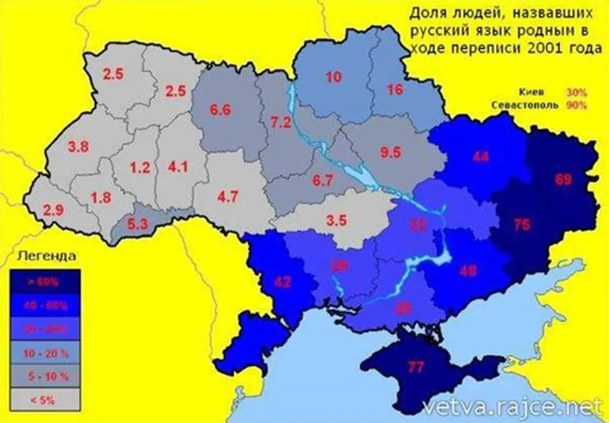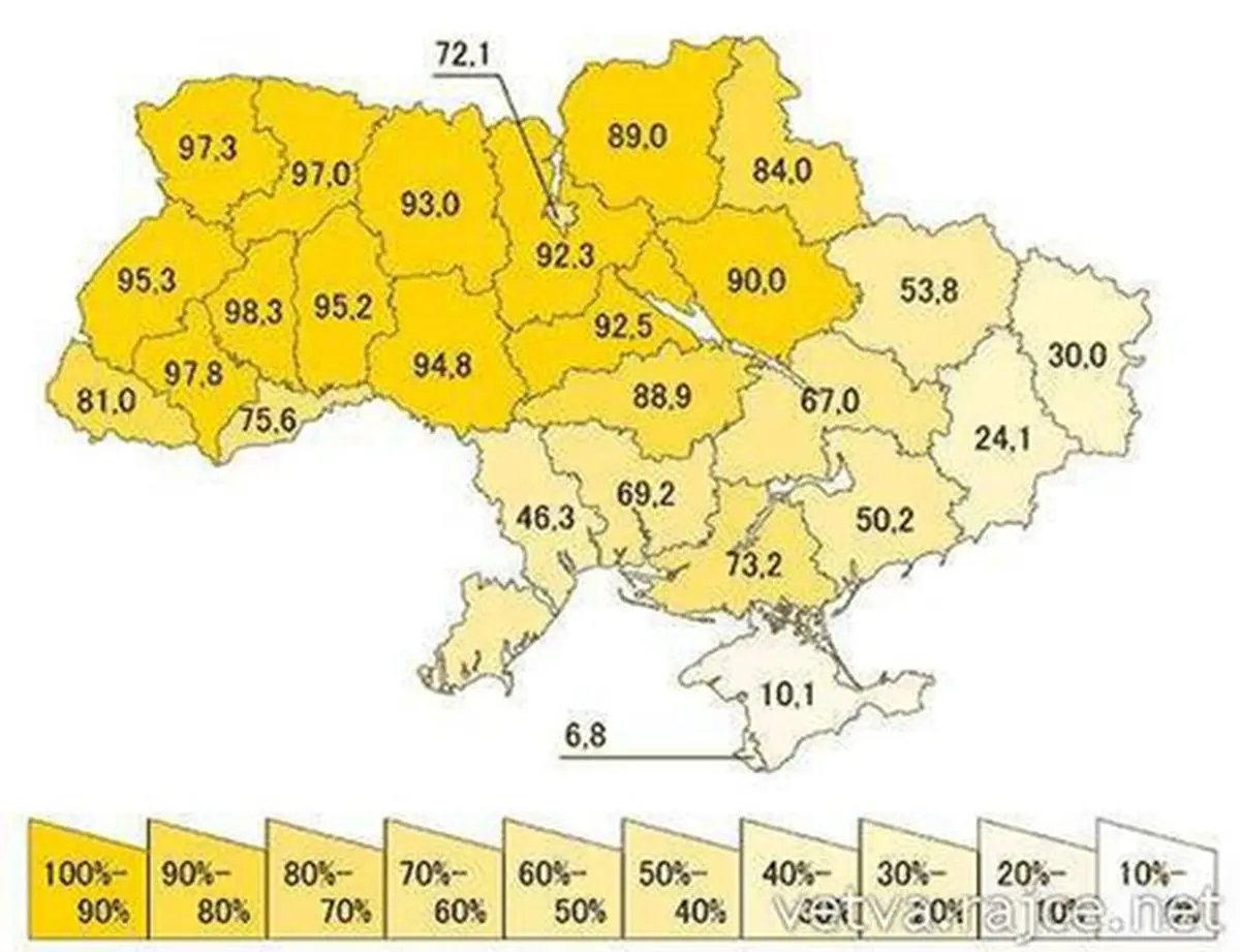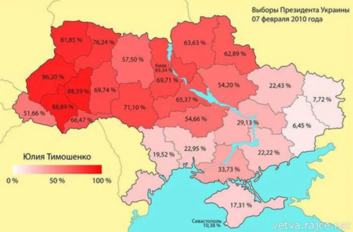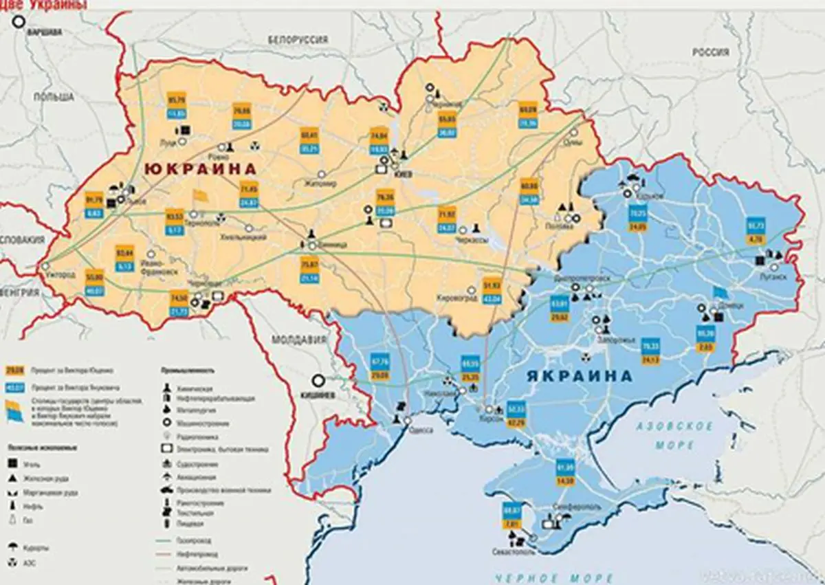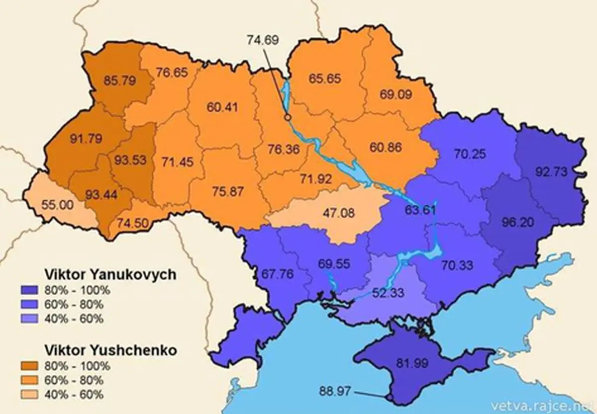 Takhle by mohla vypadat mapa se dvěma novyma statama. Vlevo Jukrajina (pojmenovane podle Juščenka), vpravo Jakrajina (podle Janukovyča). Proč by to tak mělo byt? Podivejte se na mapy niže…