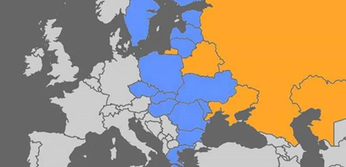 Geopolitycka mapa po rozděleni Ukrajiny. Modre su staty EuroSajuzoveho naraznikoveho pasma, tak jak to planoval už onkel Adolf. Žlute su staty EuroAsijskeho Sajuzu. Jedine, co može naše germanysty těšit, je fakt, že zme opět hluboko uvnitř stare, dobre Svate řiše řimske naroda německeho.